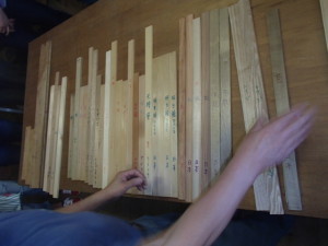 私たちが普段よく見ている障子、木製ドアがどのようにして制作されるのか材料管理から制作技術を見学させていただきました。木製建具は住宅の塗装・内装工事、設備工事が終了してから取り付けられます。それは、他の工事関係者が出はいりする中では建具に「傷」がつく恐れがあるからです。木製建具は開閉時に不具合が生じないように材料は自然乾燥材料を使います。乾燥期間は早くて半年、長いものでは10年ものもあります。木製建具の制作は職人の手作りが当たり前であったものの、現在は機械加工が主流になりつつあります。以前は木製建具のデザインも豊富でしたが、機械加工によりこれらの技術がなくなりつつあります。最後に木組みも体験させていただきました。