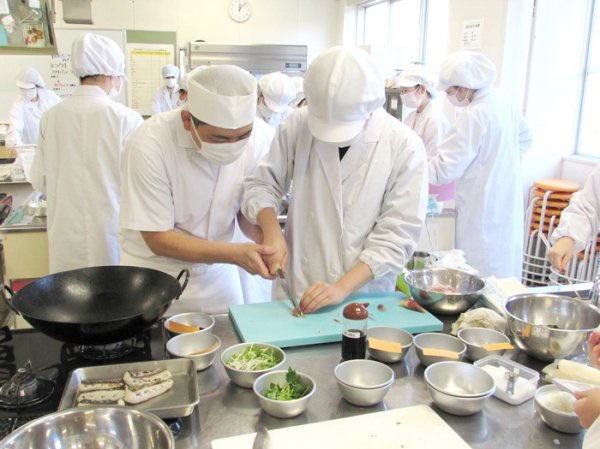 藤原先生のご指導のもと、学生たちが実際に、鰆の叩き、ねばりっこ揚げ出汁、鶏むね肉と若芽のすまし汁に挑戦しました。