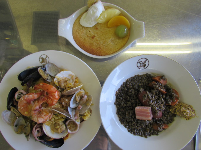 「パエリア」「ソーセージとレンズ豆の煮込み」「クレーム・ダマンド フルーツ添え」の完成です