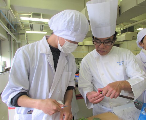 つけあわせのラディッシュの飾り切りを教えていただき、「ラディッシュをカットする際の包丁の握り方が特徴的で、実際に切り方を見せていただき、しっかりと学ぶことができた」と学生から感想を聞くことができました。