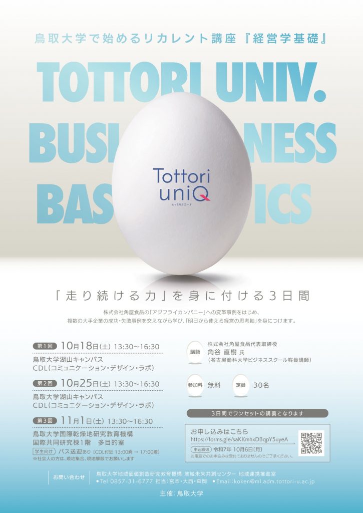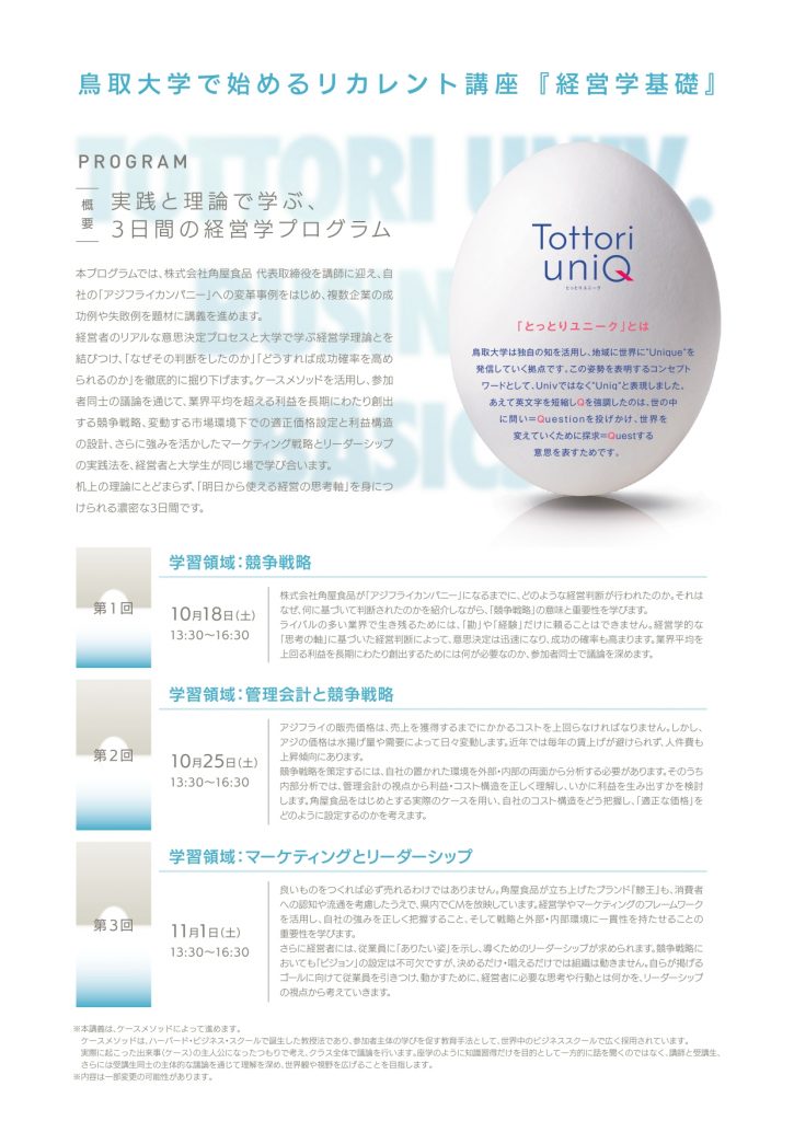 鳥取大学で後期リカレント教育特別講座「経営学基礎」を開講します
