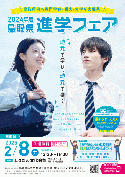 令和7年2月8日(土)、「とりぎん文化会館」にて開催される『2024年度 鳥取県進学フェア』に、鳥取看護大学と鳥取短期大学も参加します。